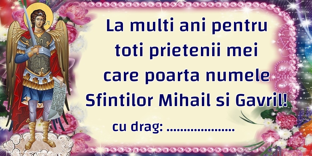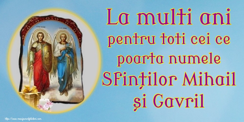 Felicitari de Sfintii Mihail si Gavril Pagina 4. Iată pentru inspirație câteva exemple de felicitări de Sf Iata cele mai frumoase mesaje, felicitari si urari de La Multi Ani pentru ce isi sarbatoresc onomastica de sfintii Mihail si Gavril: De ziua numelui tau, iti doresc ca toate lucrurile bune si frumoase sa te copleseasca si sa straluceasca in calea ta catre fericire.